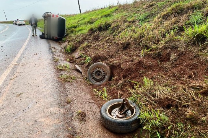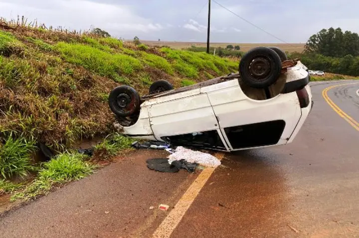 Após colisão, um veículo capota e outro tomba na margem da rodovia PR-472
