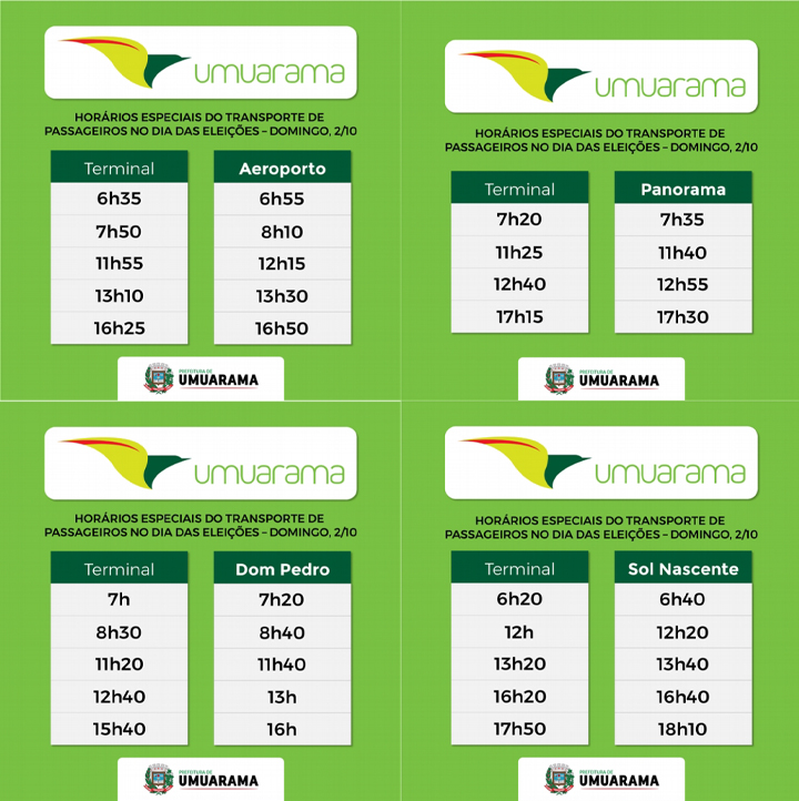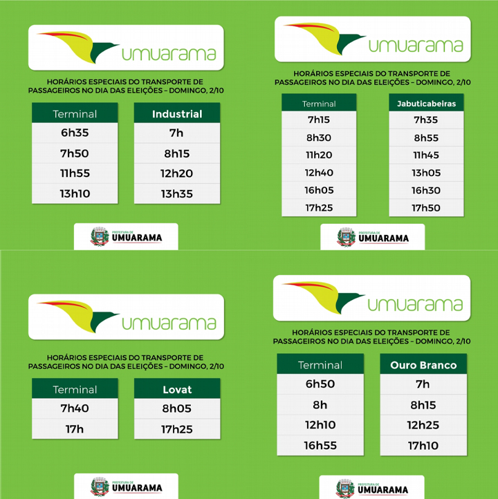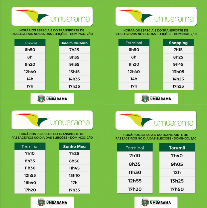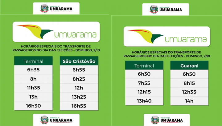 Atendendo uma solicitação do prefeito Hermes Pimentel, a Viação Umuarama – concessionária do transporte coletivo urbano – terá horários especiais de circulação de ônibus em todas as regiões da cidade no próximo domingo (2), dia em que serão realizadas as eleições gerais para escolha de presidente, governador, senador e deputados federais e estaduais.