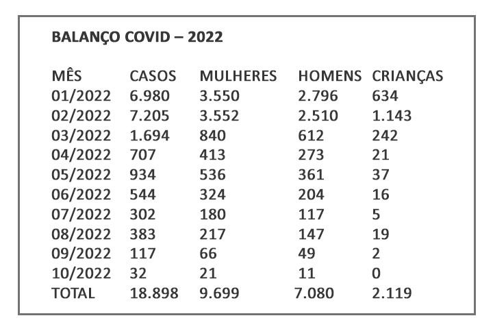 Os novos positivados são dois homens, elevando para 32 o total de pessoas diagnosticadas com a doença neste mês. Em outubro, a média de casos é de 1,3 casos por dia, a menor desde o início da pandemia de coronavírus em março de 2020.