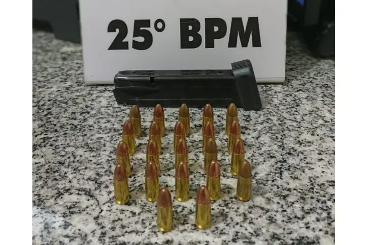 Foi então que, dentro de uma embalagem plástica a PM encontrou um carregador de pistola e 22 munições calibre 9mm que o condutor assumiu ser de sua autoria e disse ainda que seria destinado à venda.