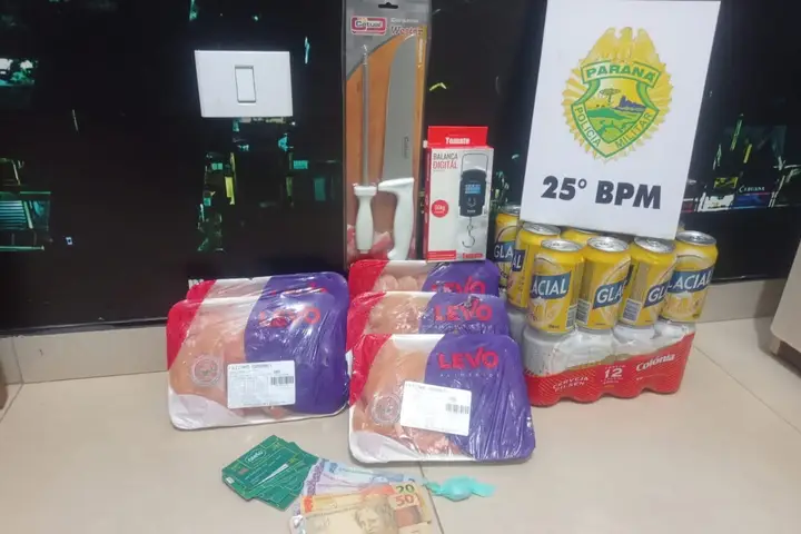 A Polícia Militar (PM) prendeu um homem de 42 anos que teria furtado 24 latas de cerveja, 5 bandejas de frango, uma faca de churrasco, uma balança digital, além de cartões e dinheiro de um mercado no Centro de Altônia. A situação aconteceu por volta das 23h40 desta quarta-feira (2).