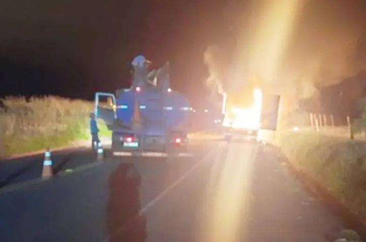 Ele parou o caminhão no acostamento e viu que a carga, que estava acondicionada no baú do veículo (cenário e artefatos de peças de rodeio) começou a pegar fogo, incendiando totalmente a carga e caminhão.