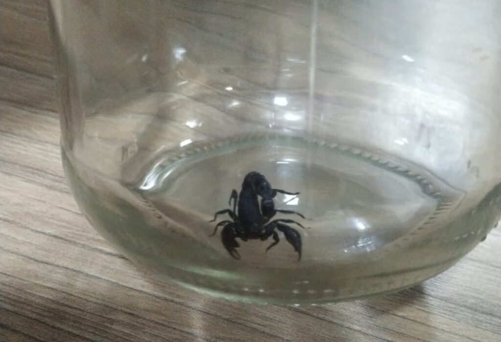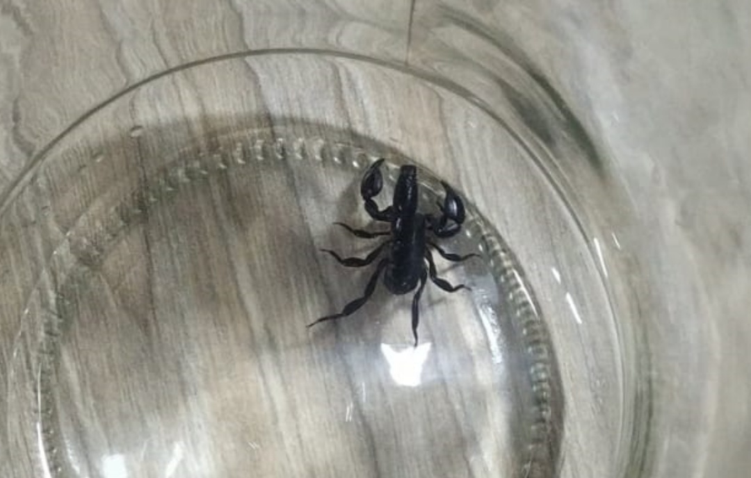Danilo enviou as fotos de um escorpião preto que encontrou na última sexta-feira (16). O morador comentou que tem uma filha de 6 anos com Síndrome de Down, o que causa ainda mais temor.