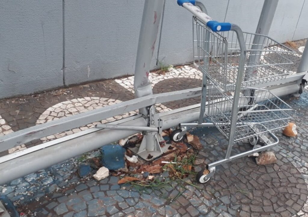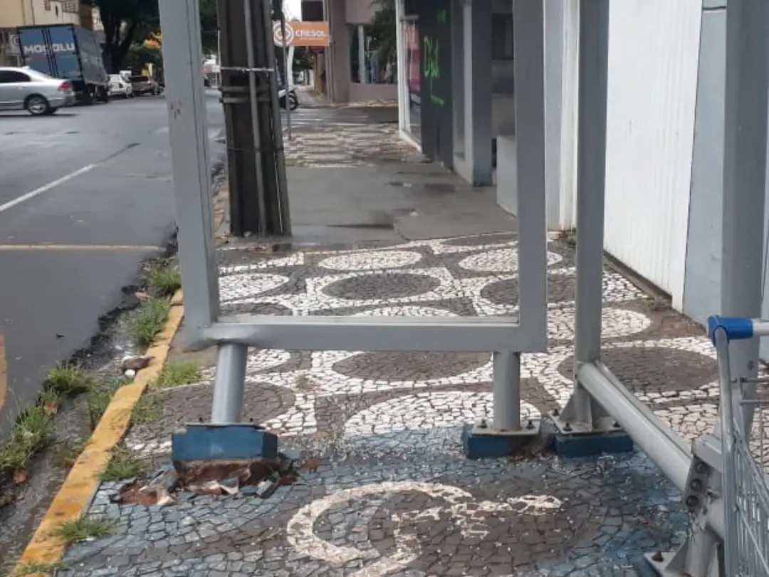 A funcionária de um comércio da localidade mostrou que o ponto de ônibus foi danificado em um acidente de trânsito. Um veículo invadiu o espaço no dia 25 de setembro.