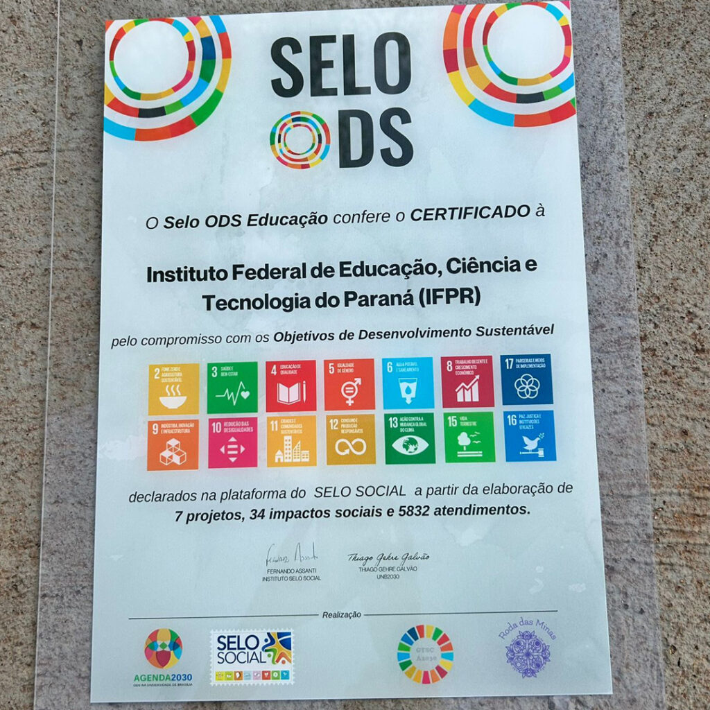 O IFPR foi certificado pelo compromisso com os Objetivos do Desenvolvimento Sustentável (ODS), declarado na plataforma do Selo Social, a partir de sete projetos, 34 impactos sociais e 5.832 atendimentos. A ação reconhece as unidades de ensino que desenvolvem projetos em prol dos ODS no Brasil.