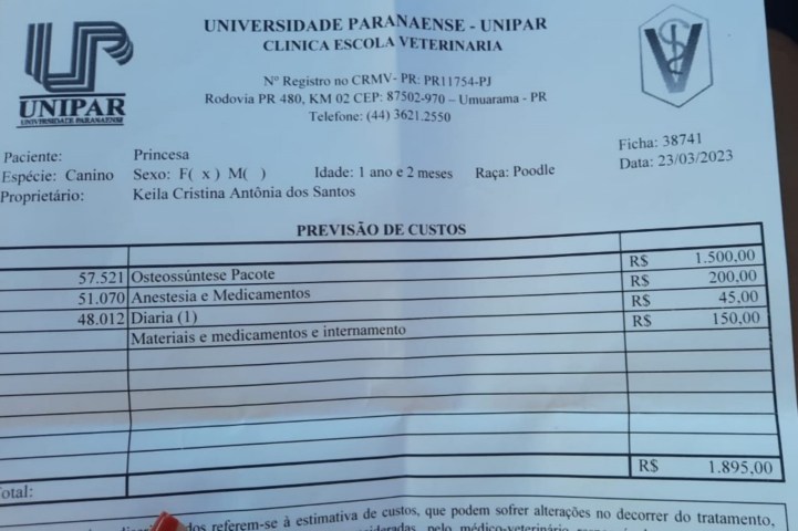 A tutora Keila dos Santos Duarte está pedindo ajuda para custear as despesas veterinárias de sua Poodle chamada Princesa, que foi atropelada por um carro na noite desta quinta-feira (23), no bairro Sonho Meu 1, em Umuarama. De acordo com a tutora, a cachorrinha fraturou a bacia com o acidente e não consegue mais andar.