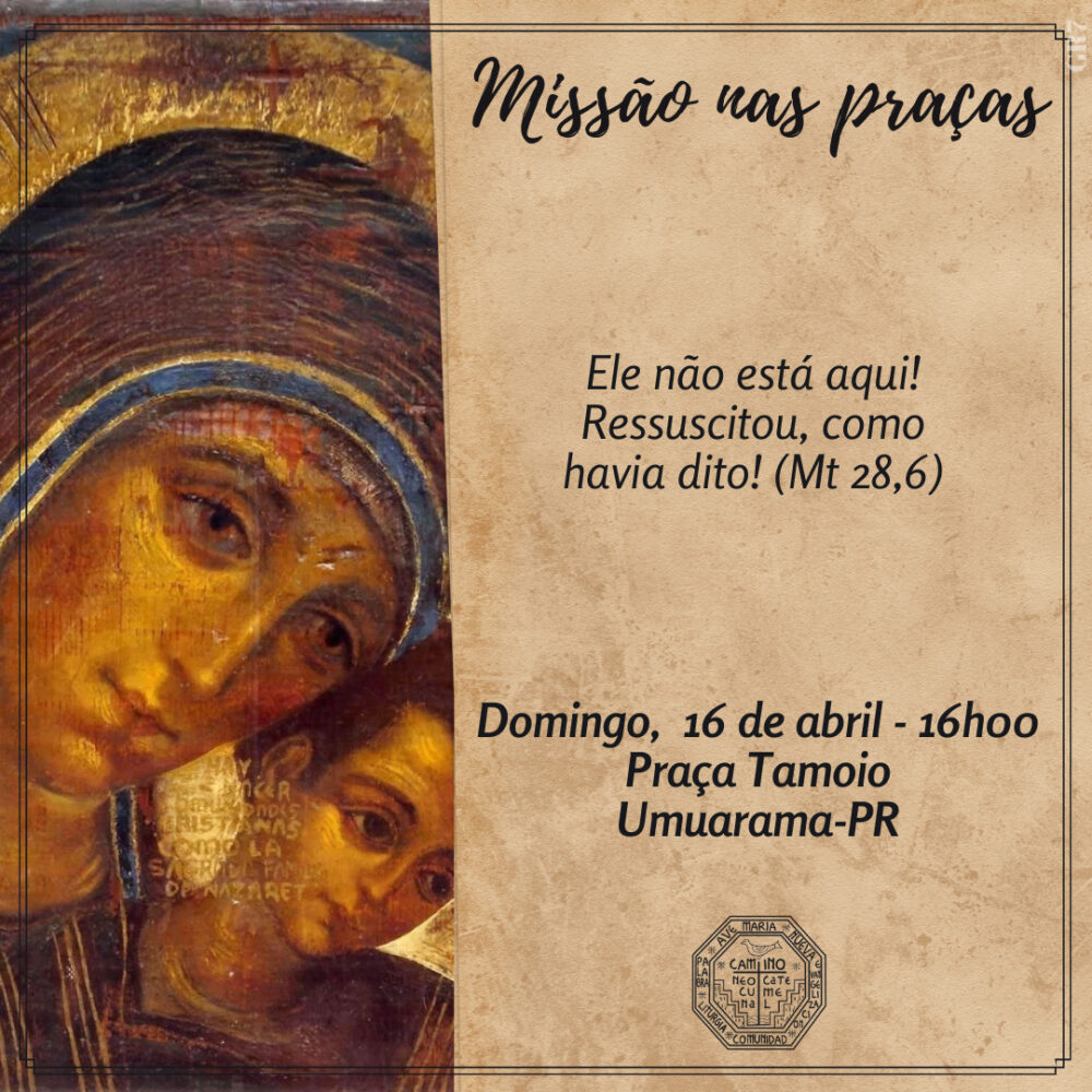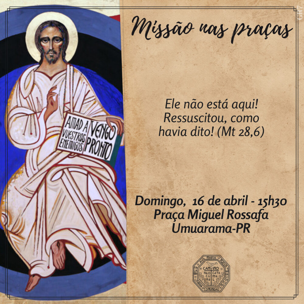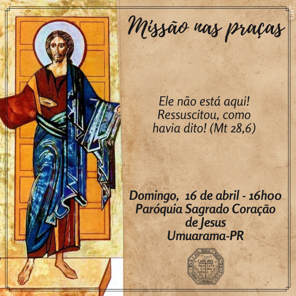 Neste domingo (16), às 16h, as Comunidades Neocatecumenais de Umuarama realizarão a Missão nas Praças. Este ano, a missão acontecerá nas praças Miguel Rossafa, Tamoio e na frente da Paróquia Sagrado Coração de Jesus, no Jardim Belvedere.
