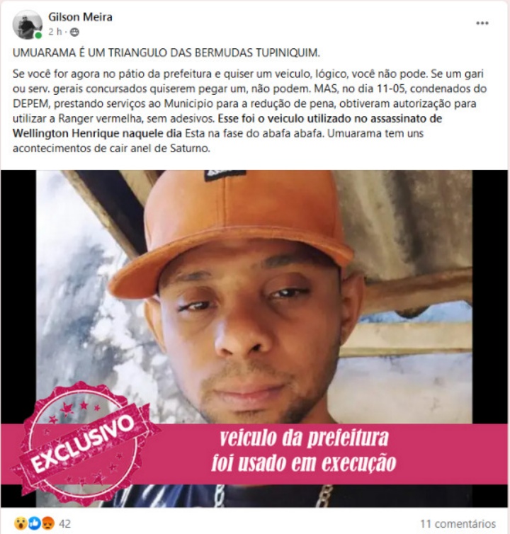 Se você for agora no pátio da prefeitura e quiser um veículo, lógico, você não pode. Se um gari ou serv. gerais concursados quiserem pegar um, não podem. MAS, no dia 11-05, condenados do DEPEM, prestando serviços ao Município para a redução de pena, obtiveram autorização para utilizar a Ranger vermelha, sem adesivos. Esse foi o veículo utilizado no assassinato de Wellington Henrique naquele dia está na fase do abafa abafa. Umuarama tem uns acontecimentos de cair anel de Saturno”.