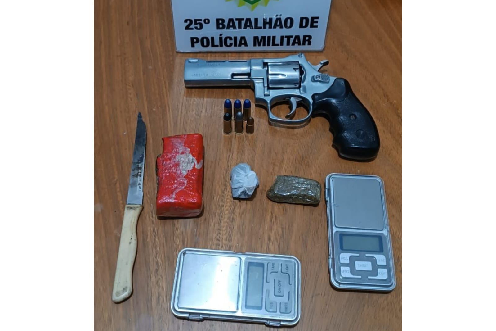 Durante a checagem os militares não encontraram nenhum ilícito com o condutor ou dentro do veículo, porém na sequência foi iniciado uma busca na casa do morador, onde foi encontrado um revólver .38, quatro munições intactas e uma deflagrada do mesmo calibre. No local havia também 125 gramas de substância com característica de maconha.
