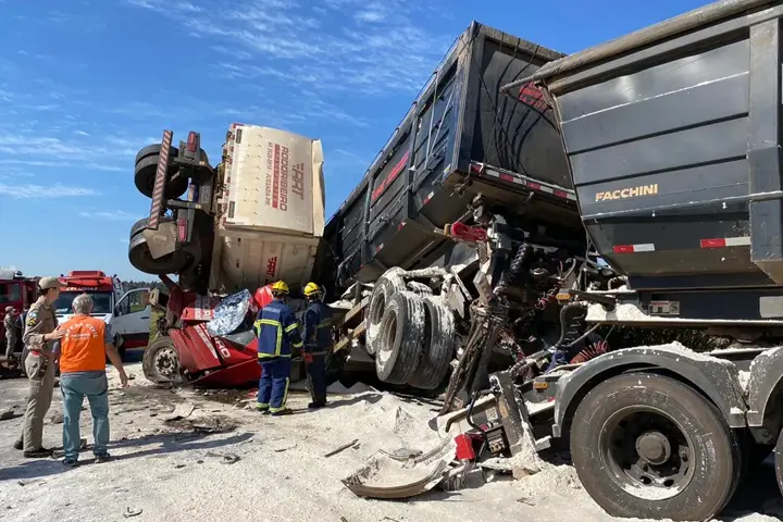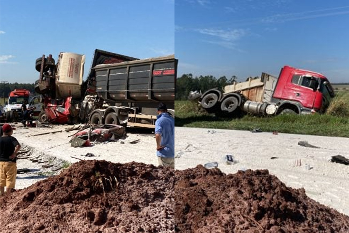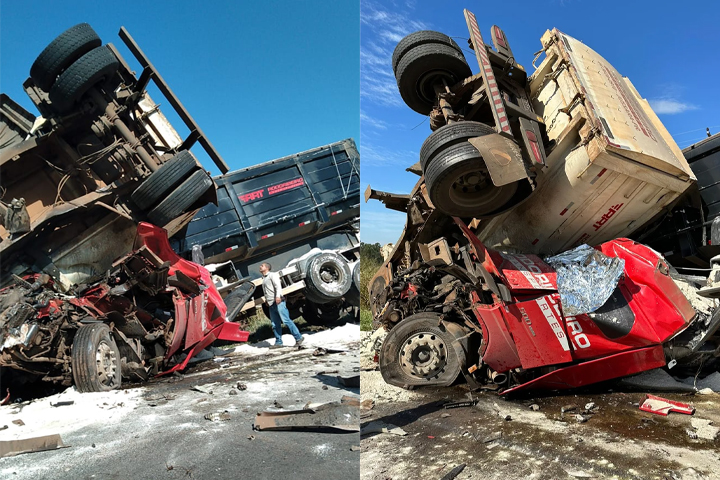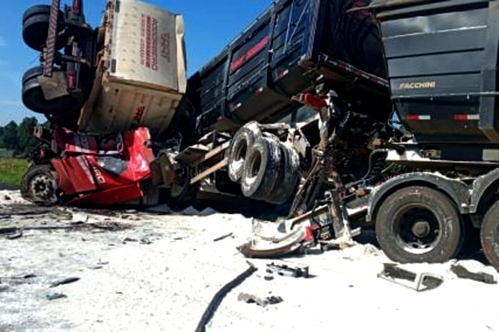 Um acidente envolvendo dois caminhões, nesta sexta-feira (23), na PR-498, entre Presidente Castelo Branco e Floraí, deixou os veículos esmagados e, de acordo com informações do Samu (Serviço de Atendimento Móvel de Urgência), os condutores preso entre às ferragens.