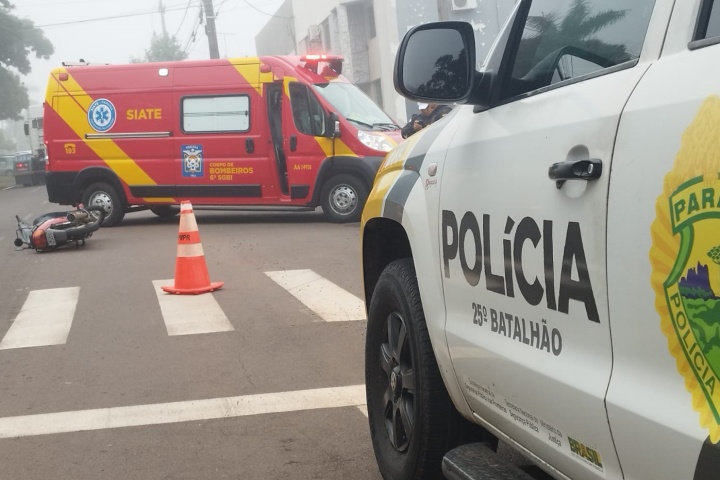 Um homem de 49 anos que conduzia um veículo Chevrolet Onix colidiu contra uma Honda Biz pilotada por uma mulher de 49 anos, na manhã desta terça-feira (18), em Umuarama. A motociclista teve escoriações leves e foi encaminhada para o Pronto Atendimento (PA).