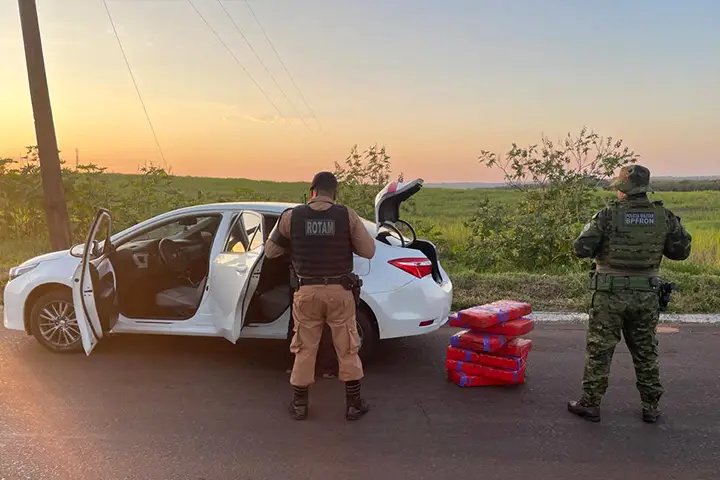 Equipes policiais apreenderam um veículo carregado com 101,7 quilos de maconha na rodovia PR-082, município de Rondon. A ação foi realizada pelo Batalhão de Polícia da Fronteira (BPFron) e pela Rotam do 7º Batalhão de Polícia Militar (PM).