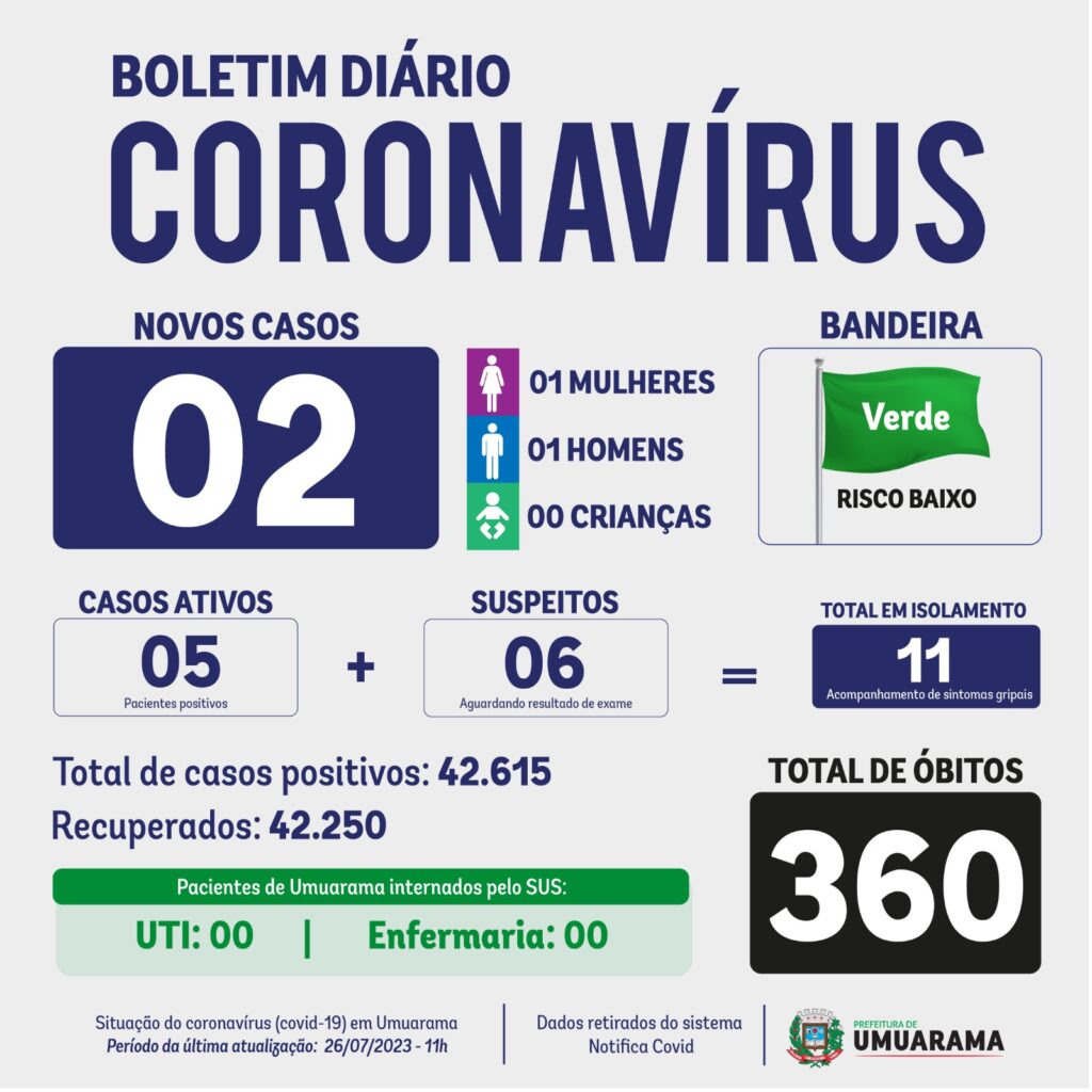Ainda segundo o Boletim, existem hoje 11 pessoas em isolamento domiciliar, considerando que são cinco casos confirmados (ativos) e outros seis suspeitos, com os pacientes aguardando por resultados de exames. A Sesa (Secretaria de Estado da Saúde) continua classificando Umuarama com bandeira verde, quando o risco de contaminação é considerado baixo.