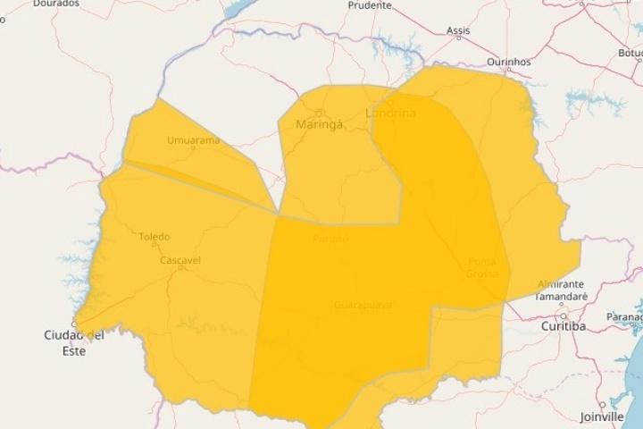 O aviso foi enviado por volta das 8h20 e tem vigência de 6 horas, ou seja, até as 14h20 de hoje. Veja abaixo o mapa das regiões em alerta: