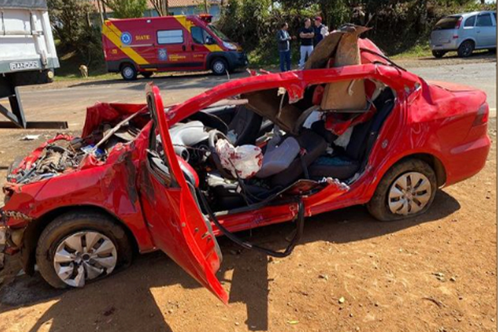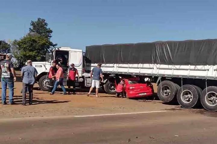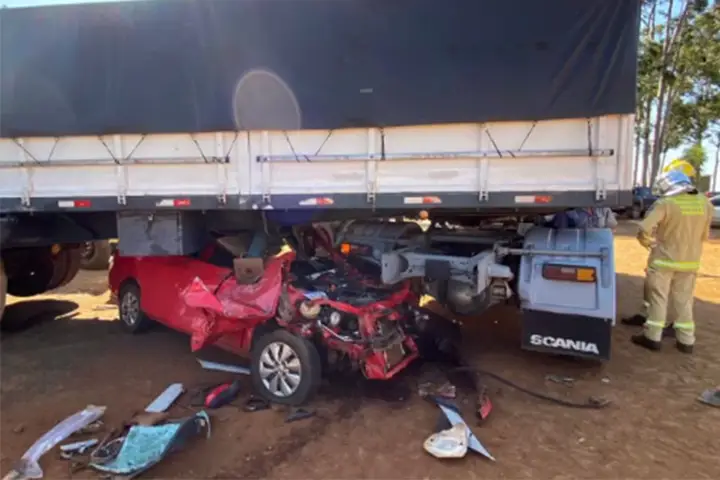 De acordo com informações do Corpo de Bombeiros, o carro ficou prensado no semirreboque da carreta e duas vítimas ficaram presas nas ferragens.