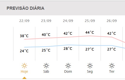 Segundo o Sistema de Tecnologia e Monitoramento Ambiental do Paraná (Simepar), a previsão para os próximos dias aponta escassas chances de chuva no estado do Paraná. Em Umuarama, as temperaturas podem alcançar valores próximos a 40°C no sábado (23), 42°C no domingo(24) e 44°C na segunda-feira, 25 de setembro.