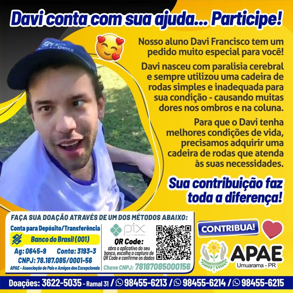 A Apae (Associação de Pais e Alunos Excepcionais) de Umuarama está promovendo uma campanha de arrecadação de fundos com o objetivo de adquirir uma cadeira de rodas personalizada para Davi Francisco, um jovem de 26 anos que enfrenta paralisia cerebral desde a infância.