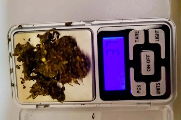Em revista pessoal foi encontrada no bolso da calça do sujeito uma porção de maconha, pesando aproximadamente 3,7 gramas.