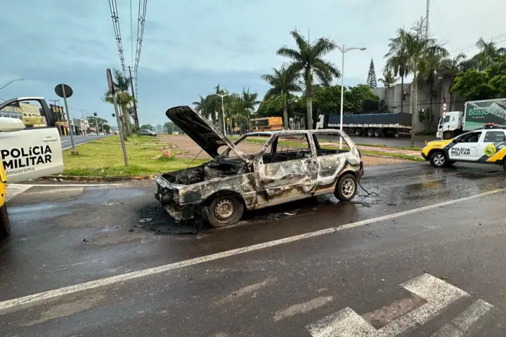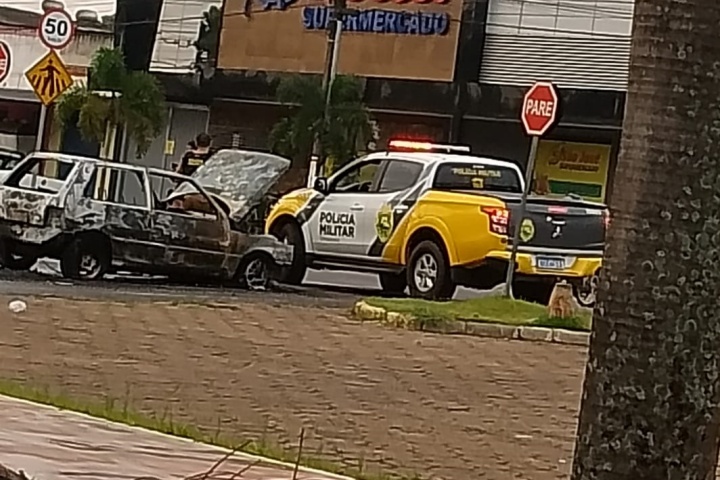 O Corpo de Bombeiros de Umuarama combateu o incêndio em um Fiat Uno que estava na avenida Ângelo Moreira da Fonseca, em Umuarama, no trecho em frente à Zaeli e ao São José Supermercados, no início da manhã desta quarta-feira (25).