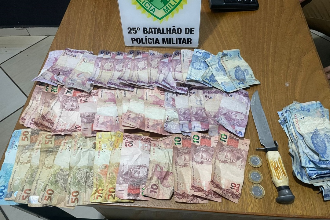 A ação aconteceu por volta das 18h. Os policiais localizaram o casal em um Ford/Ka utilizado no crime entrando no estabelecimento e imediatamente procederam para abordagem. Em revista pessoal, a equipe encontrou R$ 737 dentro da cueca do autor, além de uma faca que teria sido utilizada no crime.