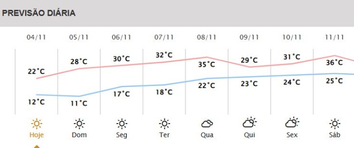 Neste sábado Umuarama deve ter temperatura oscilando entre 12ºC e 22ºC. A previsão é de domingo ensolarado com mínima de 11ºC e máxima de 28ºC. Na segunda-feira (6) o céu também deve ficar claro, com temperaturas entre 17ºC e 30ºC. Confira abaixo o gráfico para os próximos dias:
