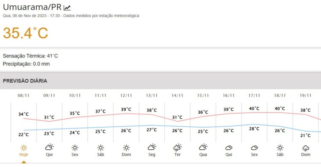 Está calor né? Para quem reside em Umuarama o calorão está implacável nesta quarta-feira (8). Por volta das 16h a temperatura chegou a 35,7ºC e a sensação térmica bateu 41ºC às 17h.