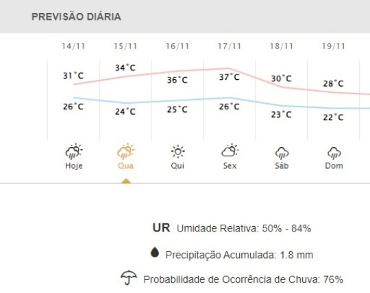 A previsão do tempo aponta que a maior parte do dia o céu se manterá ensolarado, o que contribuirá para a máxima de 34°C que será atingida por volta das 14h. Somente entre as 15h e 16h que deverá chover os 1.2mm acumulado para o dia.