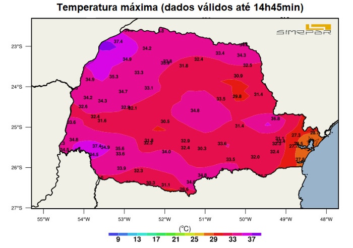 “Algumas chuvas bastante isoladas estão se formando, associadas principalmente ao efeito orográfico. De modo geral, são poucos os eventos que estão ativos, pois a maioria das regiões paranaenses segue com tempo estável. Temperaturas também estão bastante elevadas em todo o Paraná. Veja também no mapa o risco de incêndios florestais em todas as regiões paranaenses válido para as próximas 24 horas.”, diz Lidia Luisa Motta, meteorologista do Simepar.