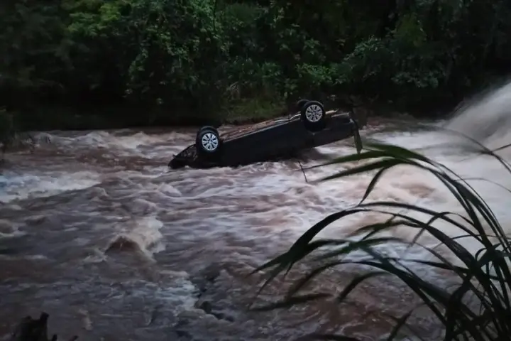 Um carro foi arrastado pela correnteza do rio Marreco, em Toledo, no fim da tarde desta quinta-feira (7). De acordo com as informações, chovia muito no momento do acidente, o que fez com que o veículo fosse arrastado e caísse em uma cachoeira próxima do local.