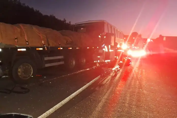 Conforme a polícia, dois veículos pesados estavam parados no acostamento da rodovia. Em determinado momento, o motorista do ônibus perdeu o controle da direção e bateu forte na traseira de um dos caminhões. Com o impacto, o caminhão ainda atingiu o outro veículo que estava parado à frente, também no acostamento.