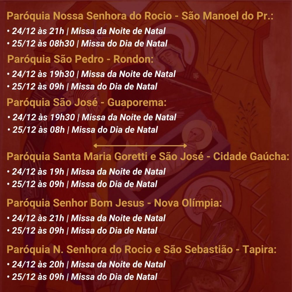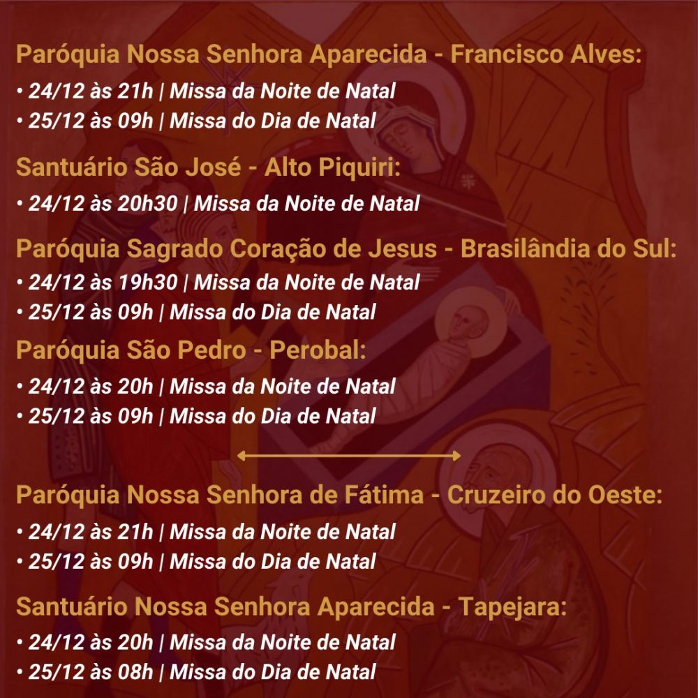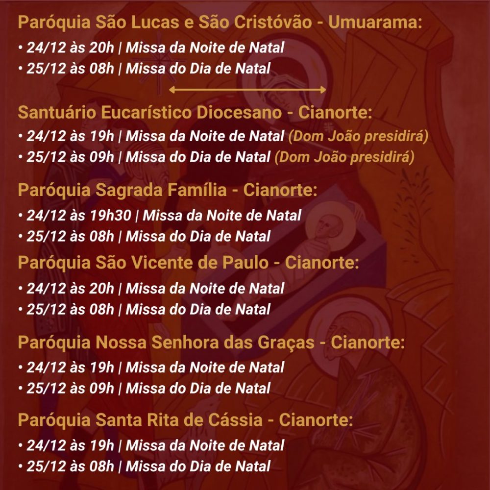 A Diocese de Umuarama divulgou os horários das celebrações natalinas nas diversas paróquias da sua região de abrangência. Na maioria delas haverá missas na noite de domingo (24), que é a véspera do Natal, e também na segunda-feira, dia 25.