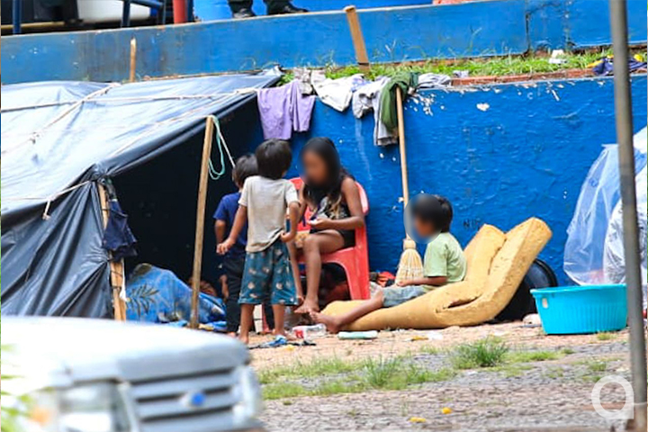 Um grupo de 18 indígenas está acampado desde a última segunda-feira (22) ao lado da rampa de acesso ao terminal urbano de Umuarama. Os indígenas, na maioria crianças e jovens, são da aldeia Rio das Cobras, de Nova Laranjeiras. O grupo também é formado por homens e mulheres de idade média.