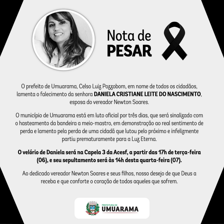 A Prefeitura emitiu uma nota de pesar onde o “prefeito de Umuarama, Celso Luiz Pozzobom, em nome de todos os cidadãos, lamenta o falecimento da senhora Daniela Cristiane Leite do Nascimento, esposa do vereador Newton Soares. Dedicada aos trabalhos de amparo e apoio à comunidade, Daniela deixa enlutadíssimos o filho Newton Junior e Bruna, familiares, amigos e inúmeras pessoas que a admiravam por seu devotamento à sociedade, principalmente àquelas famílias mais necessitadas, sendo reconhecidamente uma mulher generosa e sempre afetuosa”.