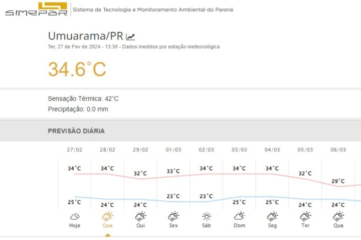 Esta terça-feira (27) deve estar agradável para os amantes do calor que vivem na Capital da Amizade. O mesmo não pode ser dito para para os que preferem o tempo frio, pois apesar dos termômetros de Umuarama registrarem 34°C na tarde de hoje – o que já é considerado muito quente – a sensação térmica extrapolou o esperado e atingiu 42°C por volta das 13h30.