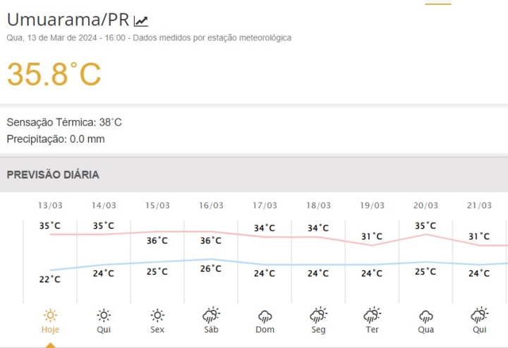 Uma onda de calor acima do normal está atingindo vários estados brasileiros e na região de Umuarama não está sendo diferente. Na tarde desta quarta-feira (13) o instituto de meteorologia Simepar informou que a temperatura na Capital da Amizade chegou aos 35,8ºC por volta das 16h15 e a sensação térmica atingiu 38ºC.