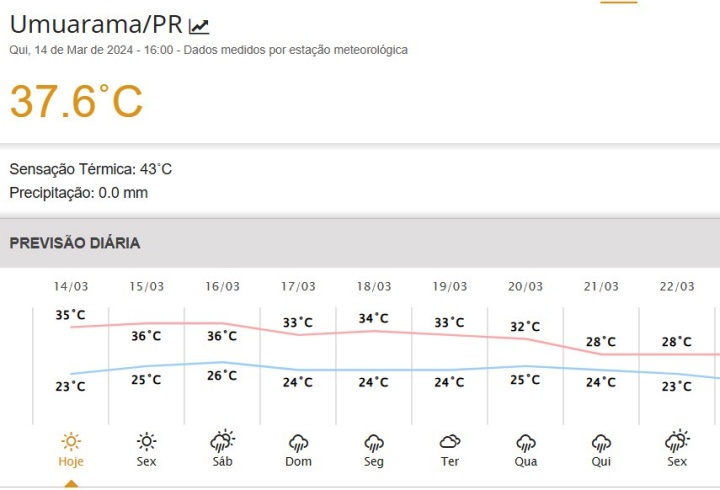 As informações foram divulgadas pelo instituto de meteorologia Simepar. A previsão inicial indicava que a máxima do dia será na casa dos 35ºC. Porém, foi superada. Na sexta-feira (15) a expectativa é de temperatura entre 25ºC e 36ºC. Mais uma vez o calor pode ser maior que o estimado.