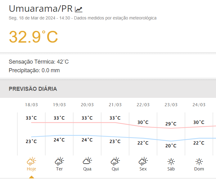 Nesta segunda-feira na Capital da Amizade os termômetros já marcam 33ºC, com uma sensação térmica de 42ºC, às 14h. Para restante da semana o Instituto de Meteorologia Simepar prevê uma mínima de 22ºC e uma máxima de 33ºC. No final de semana a variação térmica deverá oscilar entre 20ºC e 30ºC.