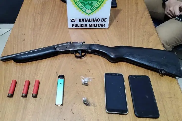 A equipe policial do 25º Batalhão da Polícia Militar de Umuarama foi acionada para intervir na situação. Durante a abordagem ao suspeito, foram encontrados diversos objetos ilícitos em sua posse, incluindo uma espingarda calibre .28 sem número de série, duas munições do mesmo calibre, porções de substância análoga à maconha, aparelhos celulares sem procedência comprovada e até mesmo um cigarro eletrônico.