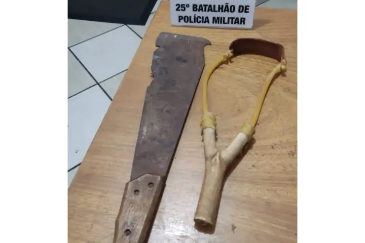 Eles receberam voz de prisão e foram encaminhados junto com o estilingue e o facão para a Delegacia de Polícia Civil de Umuarama.