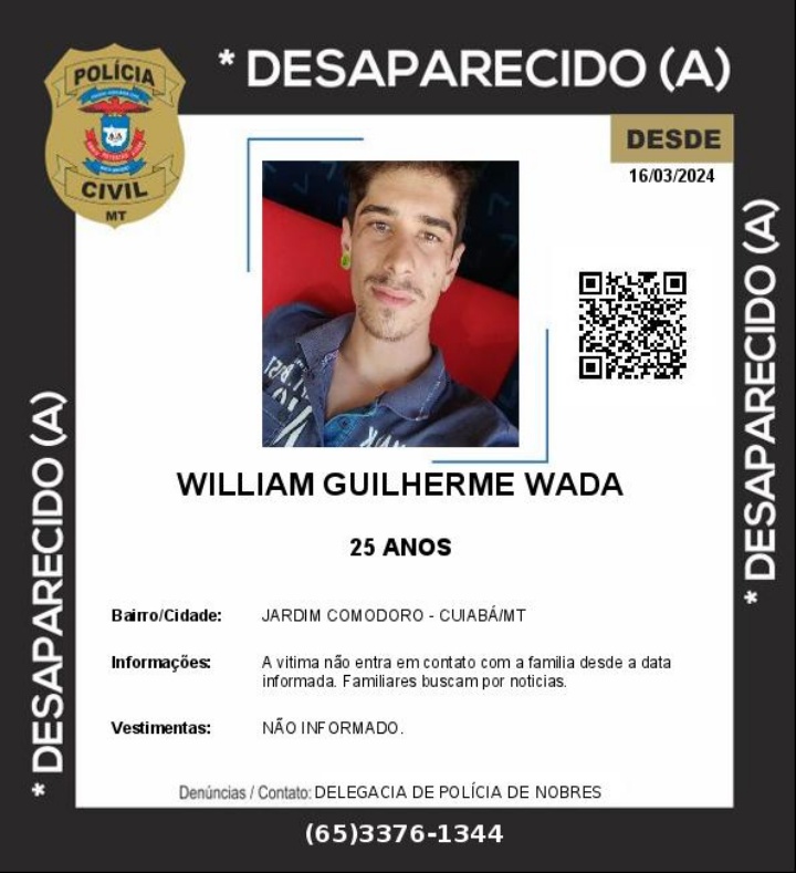 O Núcleo de Pessoas Desaparecidas da Polícia Civil do Mato Grosso, através da Delegacia de Nobres, está investigando a situação e divulgou a imagem abaixo. Não há detalhes sobre as vestimentas de Willian no dia em que desapareceu. A mãe comentou que ele não tinha muitos amigos e que ela não tem ideia de onde começar a procurar o filho.