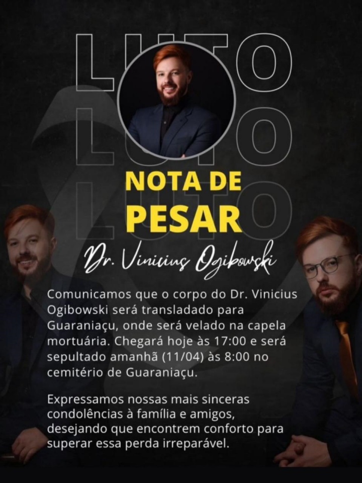 Vinicius é filho do Dr. Clayton (in memoriam) e Linda Ogibowski, uma família muito estimada em Guaraniaçu e região. O jovem estava atuando com procedimentos de transplante capilar em Umuarama. Confira abaixo uma nota de pesar divulgada nas redes sociais: