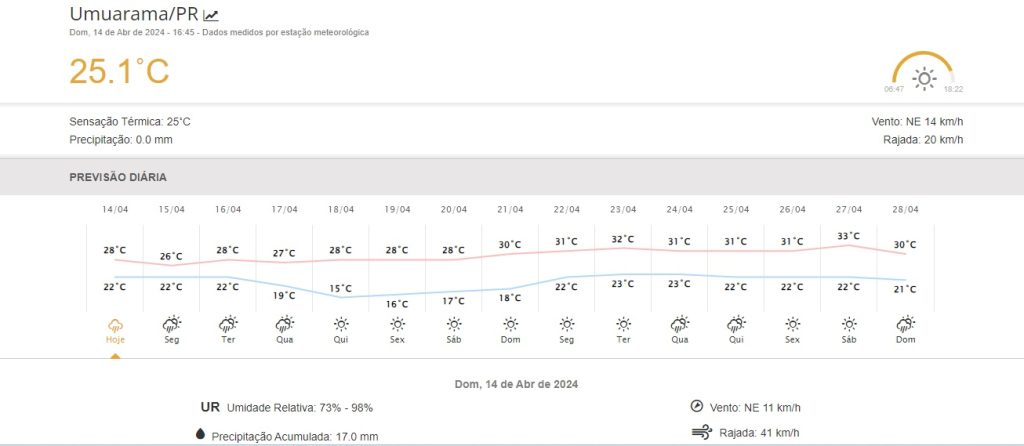 Em Umuarama, o domingo começou com chuva. O tempo instável deve permanecer até a próxima quarta-feira (17). Até lá, são esperados, segundo o Simepar (Sistema de Tecnologia e Monitoramento Ambiental do Paraná), pelo menos 37 milímetros de chuvas, 17 deles apenas na tarde deste domingo. Já as temperaturas não devem ter muitas alterações nos próximos dias. Neste domingo, a máxima não deve ultrapassar os 28°C.