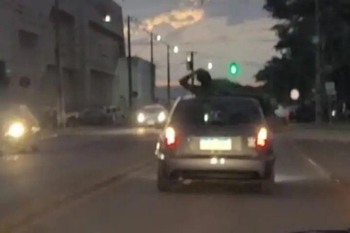 Vídeo mostra jovem deitado no teto de automóvel em movimento