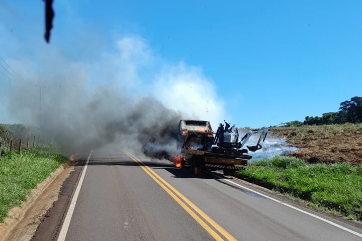 Um caminhão ficou completamente destruído após pegar fogo na tarde desta segunda-feira (6), na PR-490, entre Iporã e Altônia. A princípio as informações são de que o condutor não se feriu, porém o trânsito ficou parado durante o incêndio.