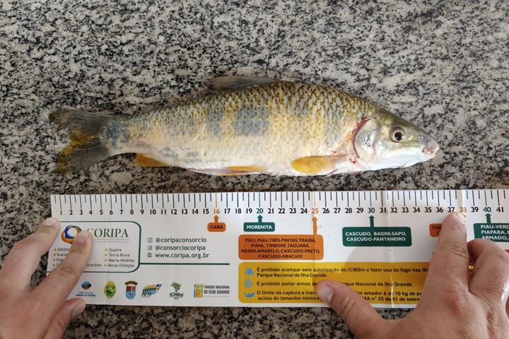 Foram localizados 10,41 quilos de pescados nativos capturados ilegalmente, entre eles um Dourado, que possui a captura proibida no Estado do Paraná, conforme Lei 19.789/2018. Também foram apreendidos exemplares de Barbado e Piapara com tamanho inferior ao mínimo permitido para captura, conforme norma do Ibama.