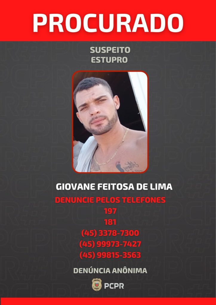 A Polícia Civil está em busca de Giovane Feitosa de Lima, acusado de estuprar uma jovem de 27 anos em Toledo, no oeste do Paraná, na última sexta-feira (17).