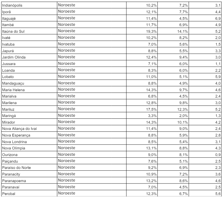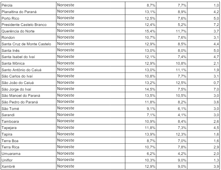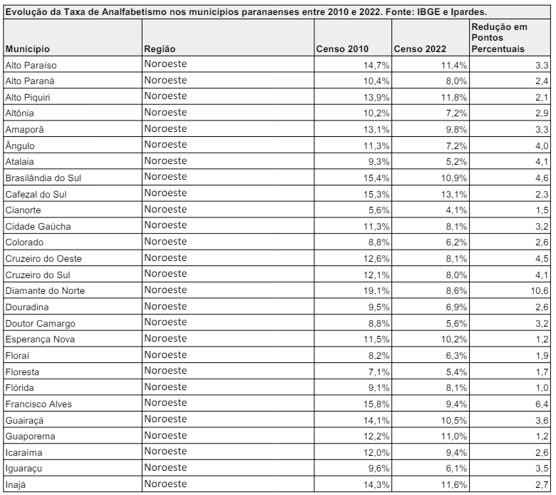 A maior queda na taxa de analfabetismo ocorreu em Diamante do Norte, onde 19,1% da população com 15 anos ou mais não sabia ler e escrever em 2010, caindo para 8,6% no levantamento de 2022. Outras quedas expressivas na região foram registradas em Presidente Castelo Branco (de 12,4% para 5,2%), São Jorge do Ivaí (de 14,5% para 7,5%), Itaguajé (de 11,4% para 4,5%) e Francisco Alves (de 15,8% para 9,4%).