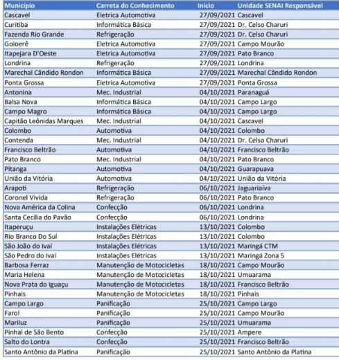 O programa Carretas do Conhecimento, que leva cursos profissionalizantes em unidades móveis a todas as regiões do Paraná, está com 1.936 vagas abertas em 36 municípios. A iniciativa do Governo do Estado é executada pela Secretaria estadual da Justiça, Família e Trabalho, em parceria como Serviço Nacional de Aprendizagem Industrial (Senai) e a Volkswagem. O objetivo é qualificar pessoas para ocuparem postos de trabalho no Estado.