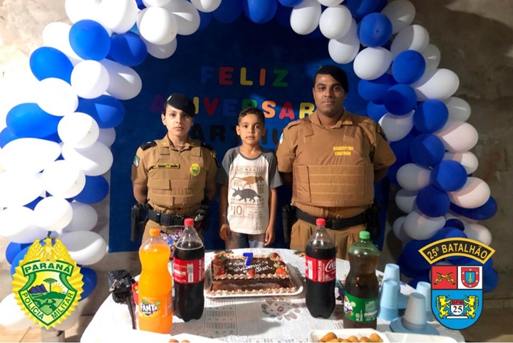 Um menino de Umuarama que é admirador da Polícia Militar (PM) teve a grata surpresa de contar com a presença de dois integrantes do 25º Batalhão (BPM) em sua comemoração.