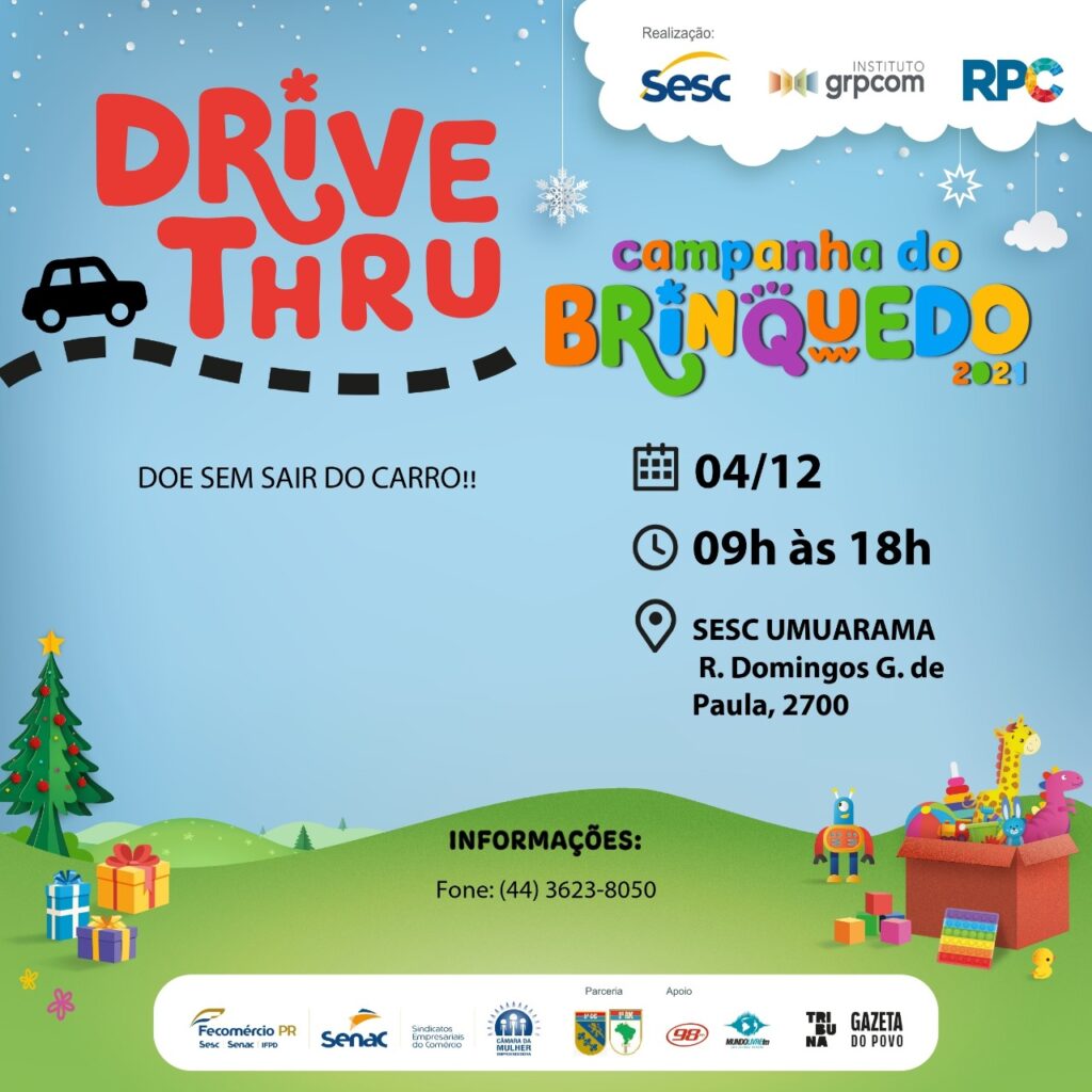 O Sesc realiza no próximo sábado (4), o drive thru para arrecadação de brinquedos que serão doados para entidades assistenciais de Umuarama. A campanha do brinquedo vai fazer crianças felizes neste Natal.